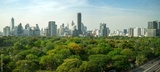 Public park and high-rise buildings cityscape in metropolis city center . Green environment city and downtown business district in panoramic view .