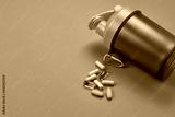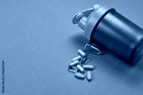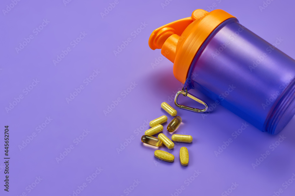 Vitamins for athletes, top view. Vitamins and fish oil capsules. Bottle Shaker and sports supplements for athletes