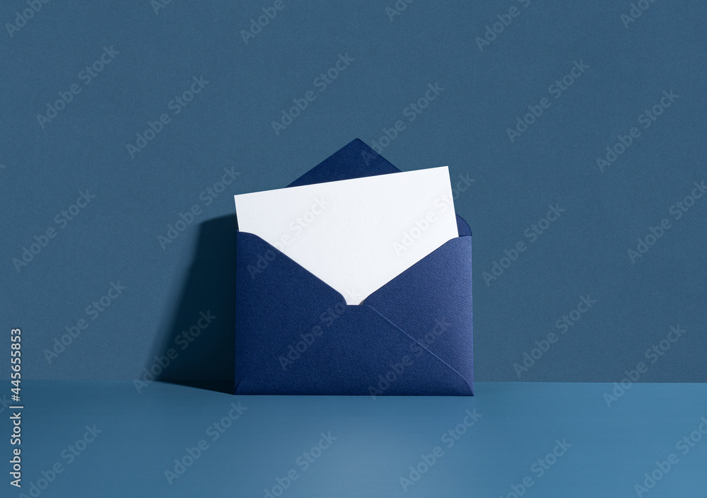White card in a dark blue seal leaning against a blue wall.