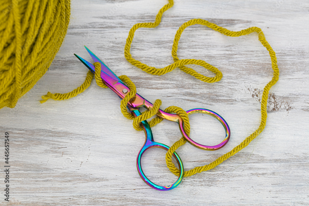 colorful embroidery scissors and green yarn on white wood table