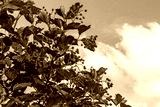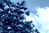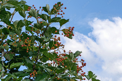 A branch of viburnum with young berries on the background of a blue sky with white clouds