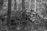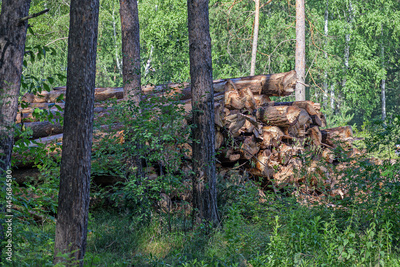 The trunks of pine trees are stacked in a pile for loading on a logging truck