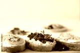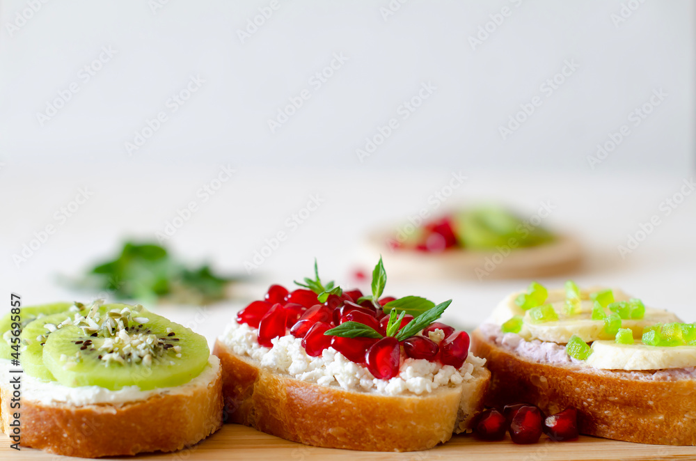 Open vegetarian sandwiches with vegetables, fruits and cream cheese on a wooden board on a white background. Healthy breakfast concept. Copy space