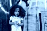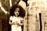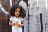 Outdoor portrait of a curly girl on a background of old metal fence. The girl drinks lemonade.