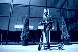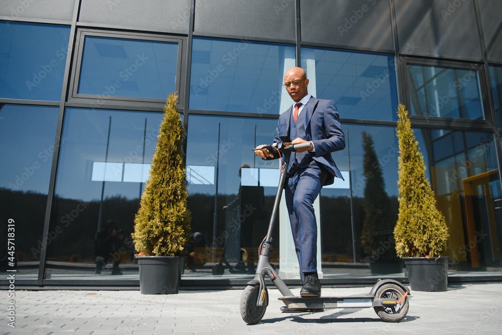 businessman with electric scooter standing in front of modern business building talking on phone.