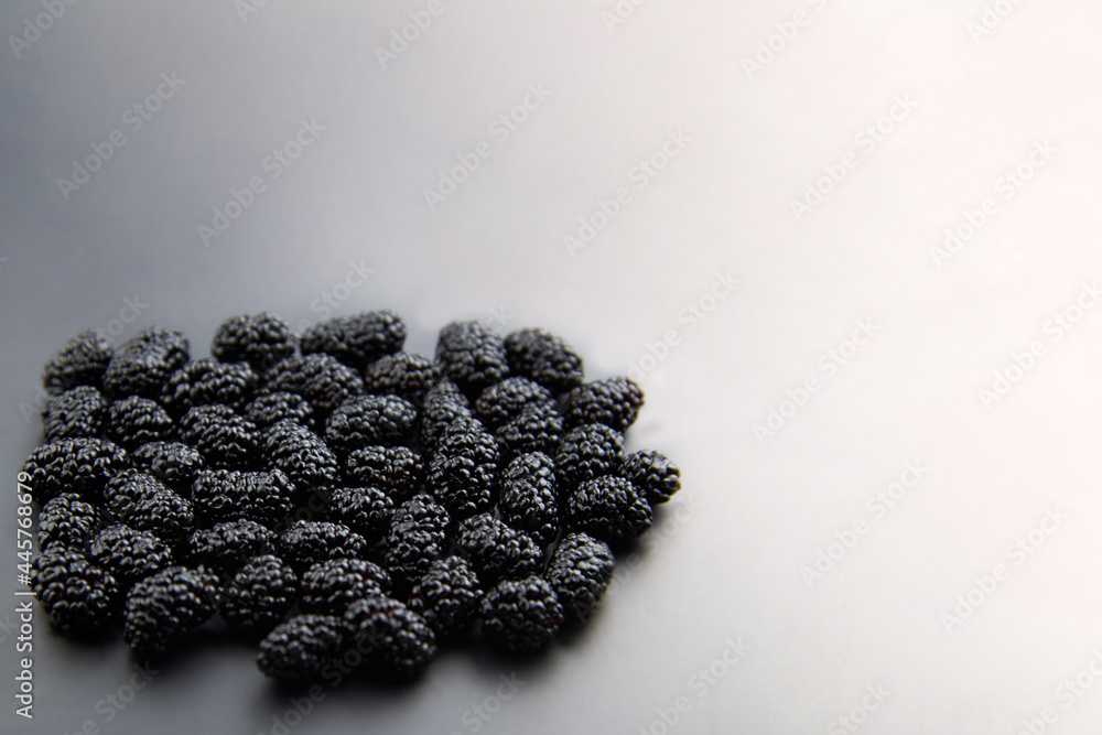 Fresh mulberry on gray background, copy space, healthy food concept.