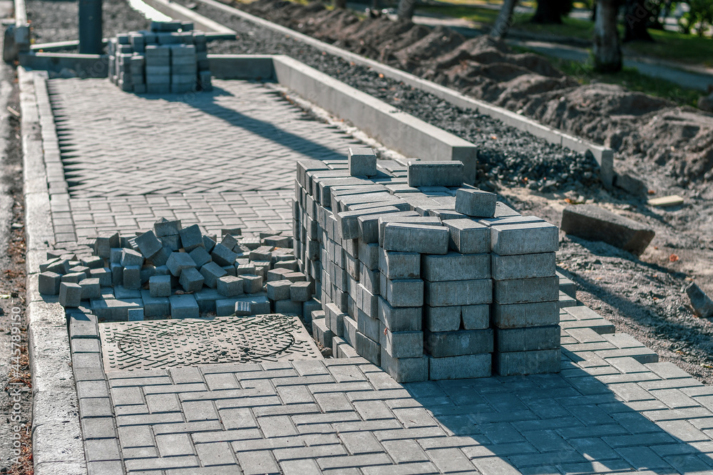 Paving new sidewalk with paving blocks during reconstruction works in the city