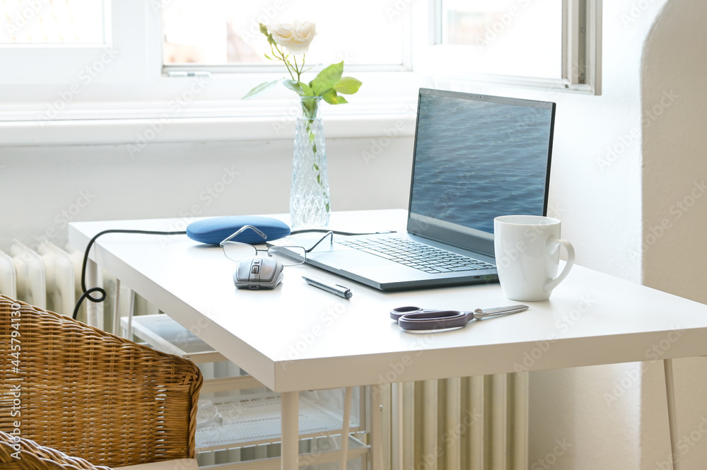 Small white desk at the window with a laptop as a workspace for studying or home office work, copy space