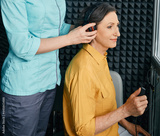 Hearing test to mature woman. Senior woman during hearing test and audiometry at hearing clinic with audiologist. Side view