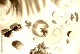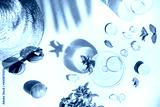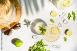 Tradition Summer drink cocktail mojito with ice, lime and mint on white with natural light and bright shadows. Top view