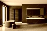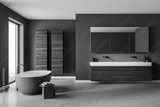 Modern bathroom interior with wood and stone decor elements and big window. Concept of contemporary design and spa relaxation.
