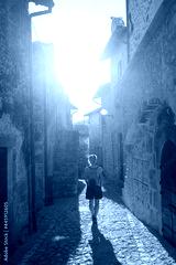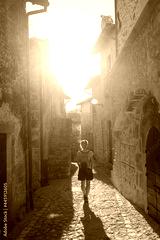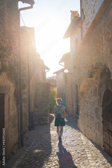 Tourist walking in Santo Stefano di Sessanio medieval village details, historical stone buildings, ancient alley, old city stone architecture. Abruzzo, Italy.