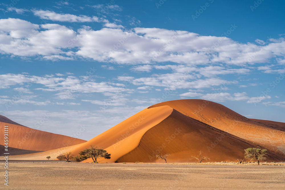 Towering sand dunes at sunrise near Sossusvlei in the Namib desert, Namib-Naukluft National Park, Namibia, Africa.