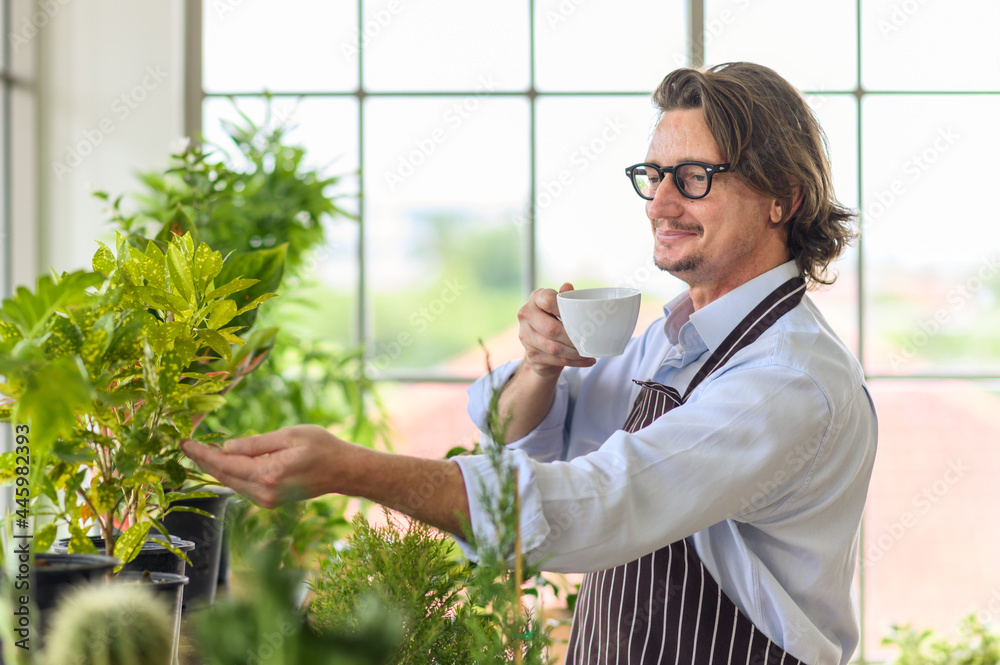 Portrait of happy senior man gardening wearing glasses and denim apron spending summer morning holding cup of hot coffee enjoying in the home gardening