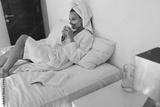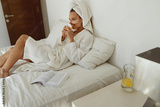 Pleased european girl drink lemonade on bed