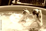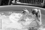 Cheerful healthy mother and daughter play in swimsuits in the pool. Time together, summer time, vacation