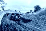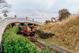 JEJU ISLAND, KOREA, SOUTH - Apr 04, 2016: Old train on tracks under a bridge on the Jeju Island in South Korea