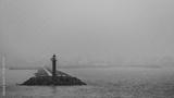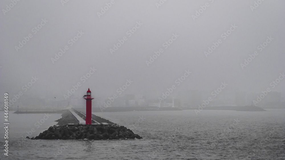 JEJU ISLAND, KOREA, SOUTH - Apr 02, 2016: Red lighthouse on the Jeju Island on a gloomy day in spring in South Korea