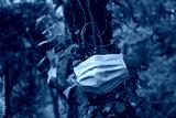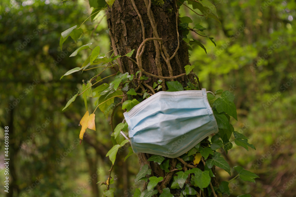 Closeup shot of a protective mask hanging off a tree