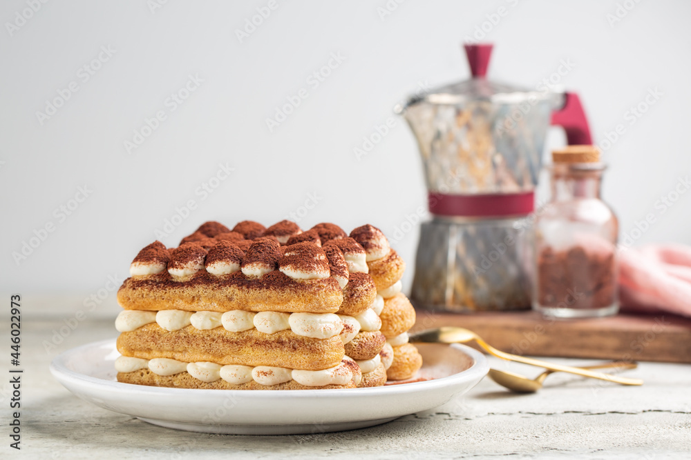 Cooking Italian dessert Tiramisu. Coffee mokka and cocoa powder are in background.
