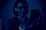 Happy woman in earbuds communicating via smartphone