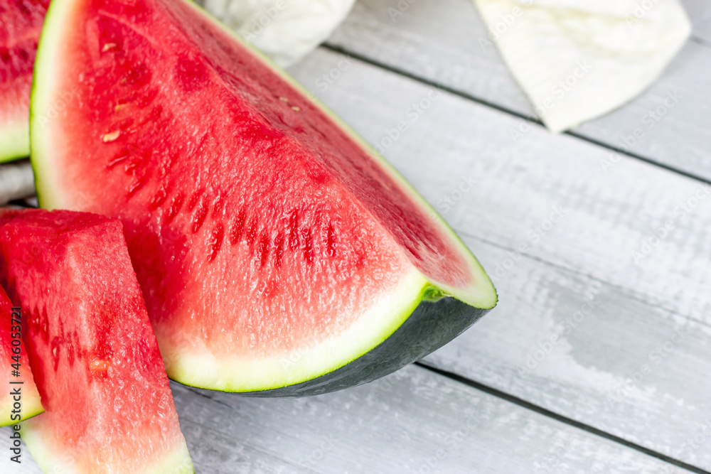 Bright sweet red and green watermelon slices in summer on light table background.