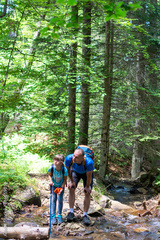 A single father with his daughter explores beautiful landscapes of untouched nature. Vertical. Travel with children. Mountain trail.
