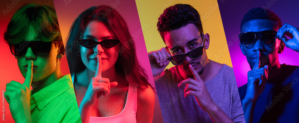 Portraits of group of people on multicolored background in neon light, collage.