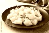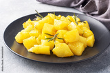 Delicious baked potatoes with spices cheese and rosemary on a black ceramic plate, a gray concrete background, copy space.