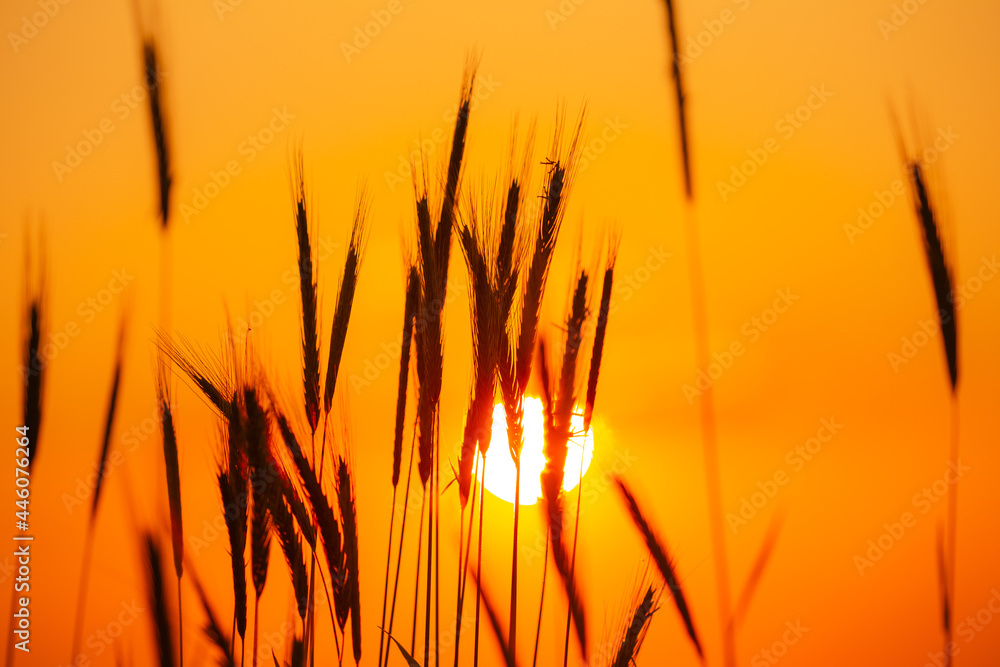 Summer Sun Shining Through Young Yellow Wheat Sprouts. Wheat Field In Sunset Sunrise Sun
