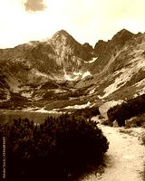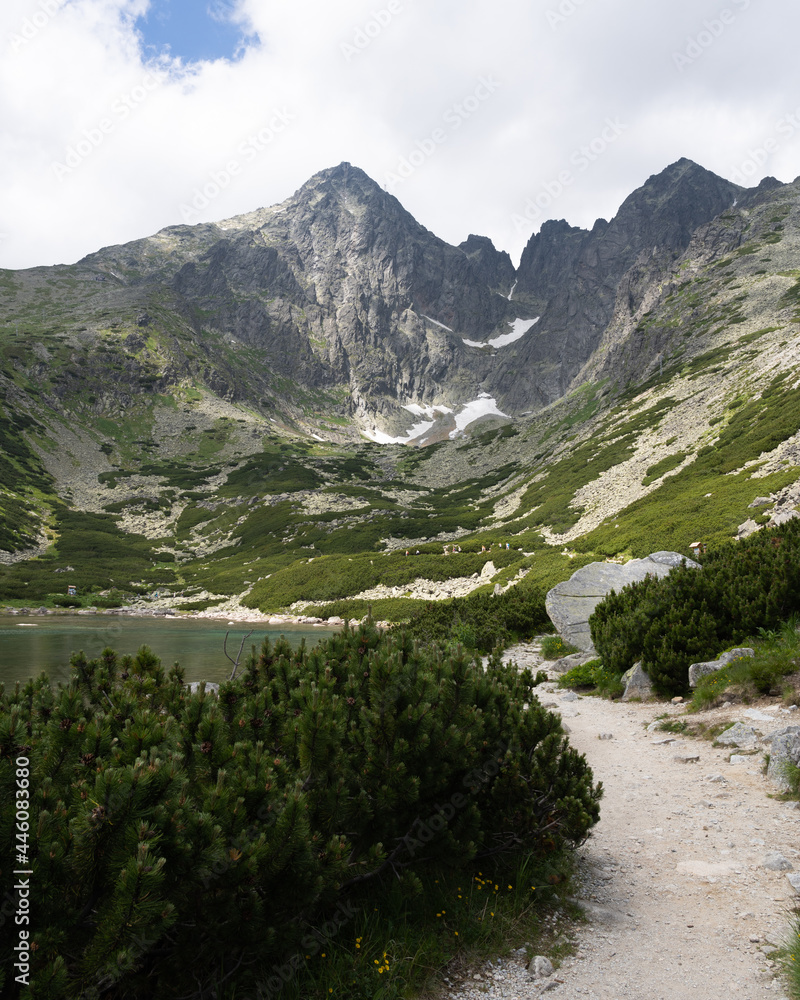 Scenic view of Skalnate Pleso (Rocky Tarn) and Lomnicky Stit peak in High Tatra mountains, Slovakia. Beautiful clean nature in Central Europe, cloudy day in summer