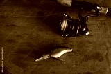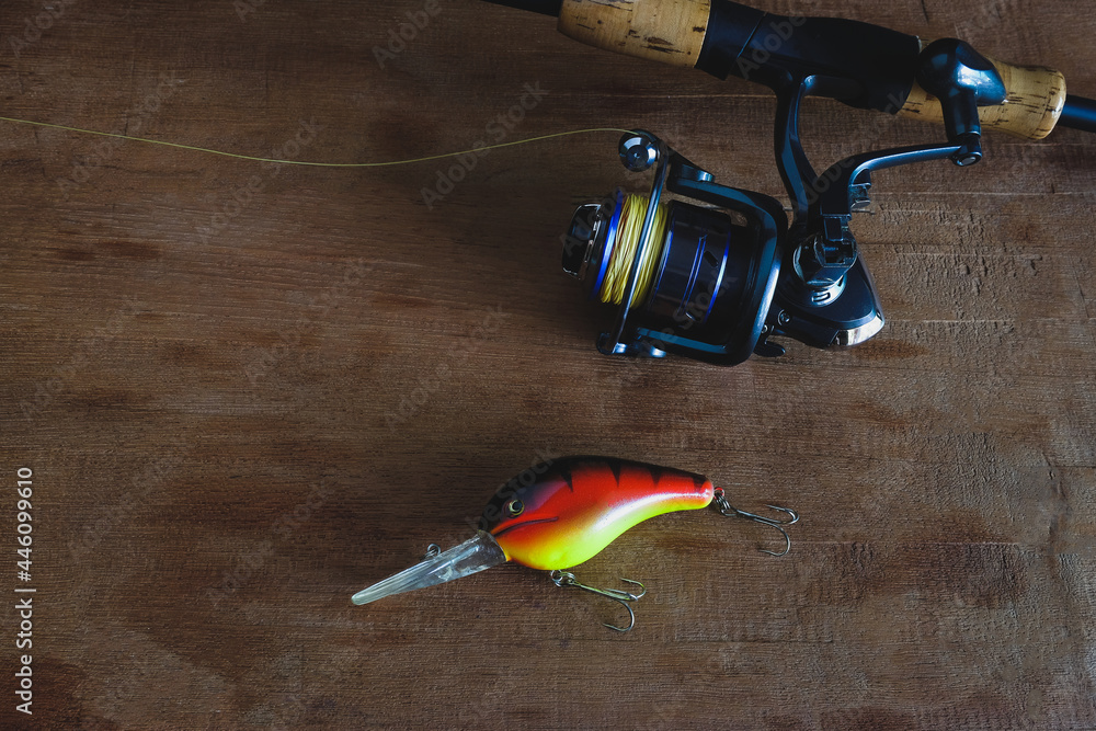 Fishing tackle - fishing spinning, hooks and lures on wooden table.