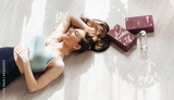 Happy smiling woman lying on floor at home or gym, resting after successful fitness workout. Stretching soft blocks and eco bottle of water. Pleasant fatigue after training. Healthy lifestyle routine