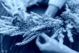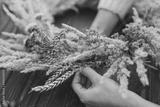 Hands making stylish autumn rustic wreath with dry grass, wildflowers and wheat on rustic wooden table in room. Fall holiday workshop. Florist making boho wreath on dark wood