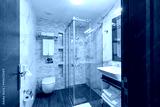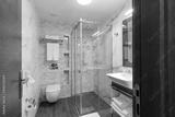Interior of a hotel bathroom with glass shower cabin
