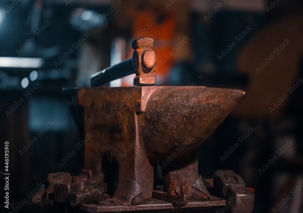 Large rusty anvil and hammer in the forge. The general blurry plan of the workshop.