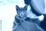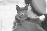 Kitten sits on a woman's shoulder, meows and looks at the camera.