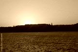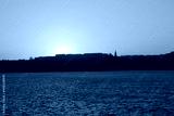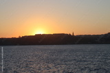 Maltese sunset from mediterranean sea, view on Gozo island from parome boat, way back home