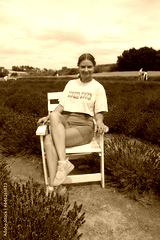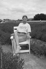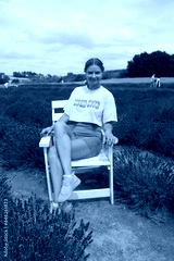 Happy young girl sitting in a lavender field on white chair smiling and happy. Face is full of joy very cute, nice and pretty