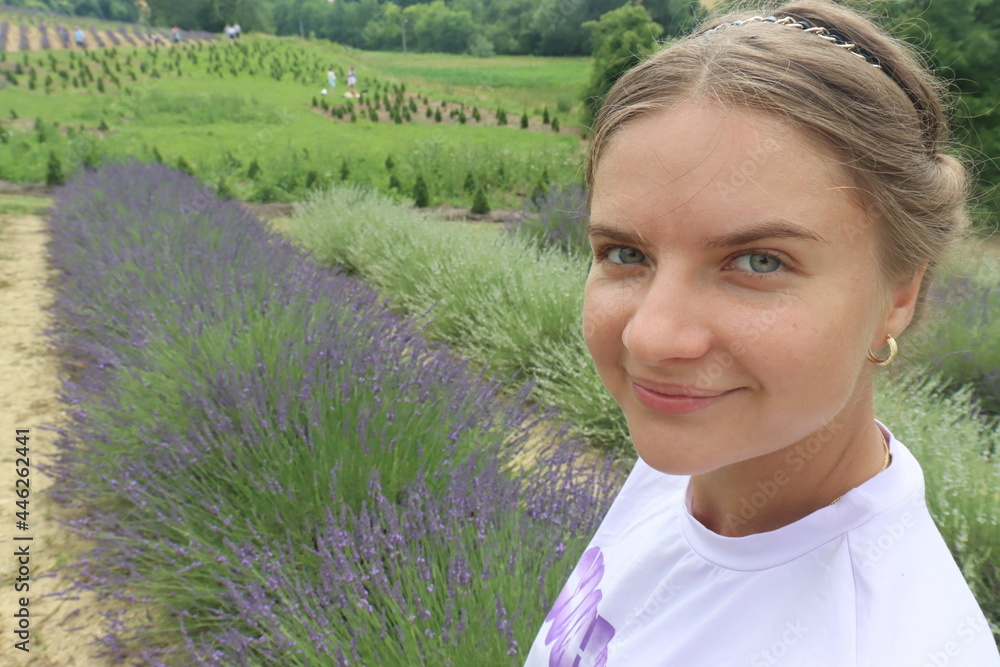 Happy young girl walking in a lavender field smiling and happy day. Very cute, nice and pretty