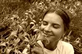 young beautiful girl surrounded by lilies in the garden posing and sniffing