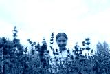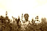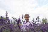 Happy young girl walking in a lavender field smiling and happy day. Very cute, nice and pretty