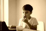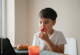 Healthy Child boy eating fresh strawberry and croissant , Happy kid watching cartoon on tablet while having breakfast. Children relaxing at home in morning, Healthy food and drink concept