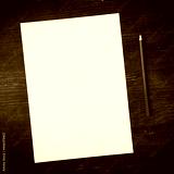 A blank white sheet and pencil for drawing on a wooden background with space for copying and lettering.
