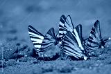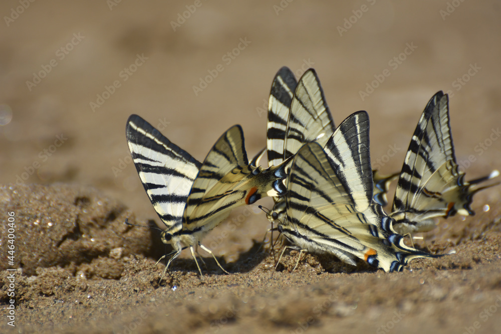 The scarce swallowtail or sail- or pear-tree swallowtail (Iphiclides podalirius). Beautiful swallowtail butterfly on ground, natural wallpaper