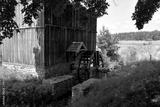 A view of an old rural mill with a wooden water wheel powered by the flow of a nearby river or lake with the main building made out of planks, logs, and boards seen on a sunny summer day in Poland