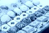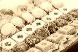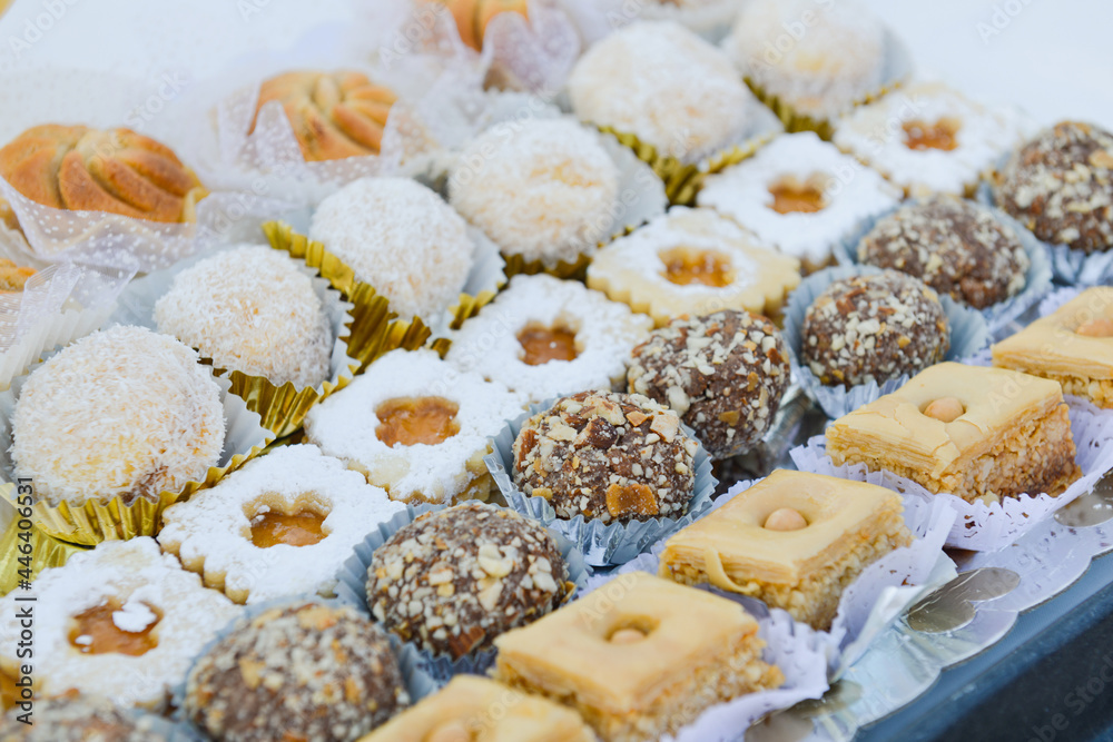 Assortiment de pâtisseries orientales traditionnelles présentées dans un plat, remplissant l'image vue de dessus