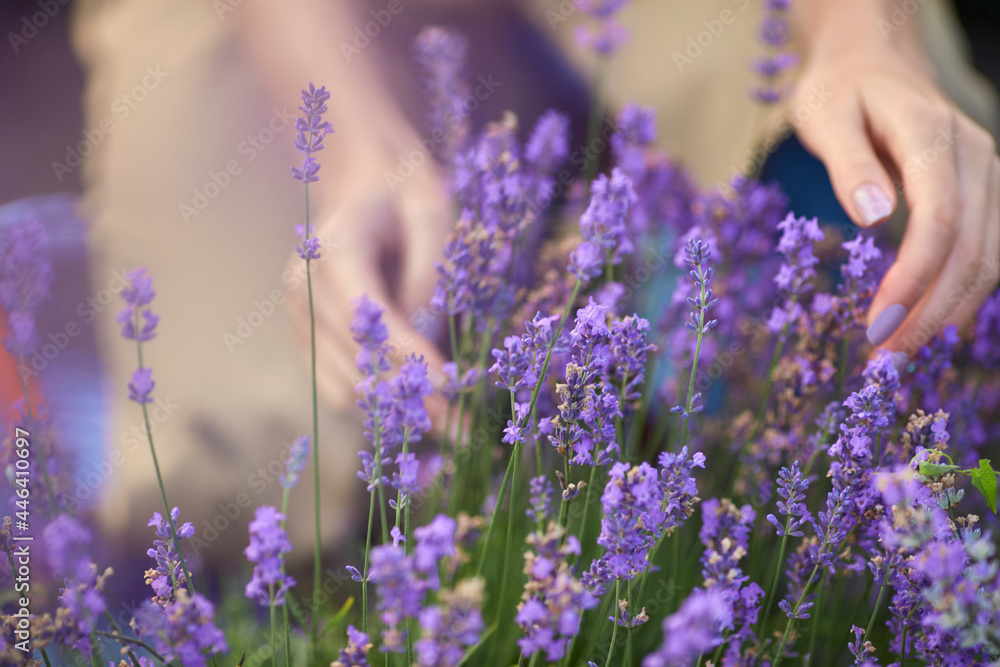 Selective focus of female hands gently touching purple flowers in endless lavender field. Unrecognizable young female enjoying summer harvest, warm sunshine. Concept of nature beauty.