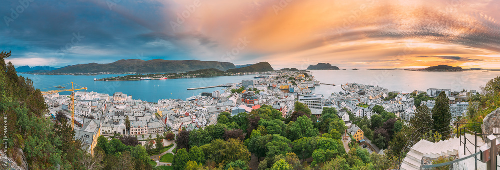 Alesund, Norway. Amazing Natural Bright Sunset Dramatic Sky In Warm Colours Above Alesund Islands. Famous Norwegian Landmark And Popular Destination. Panorama, Top View