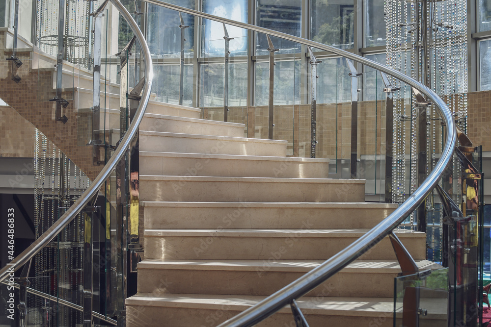 Detail of empty marble rounded staircase in the interior. Top view in perspective. Selective focus.